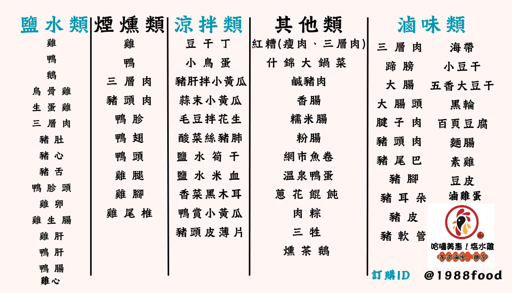 提供鹽水雞、鹽水鴨、煙燻雞、煙燻鴨,還有超過40種滷味、小菜,
